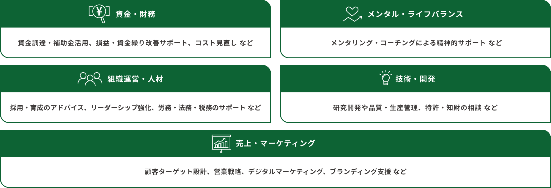 専門家が現状と経営フェーズに応じた最適な支援を行う事業です。