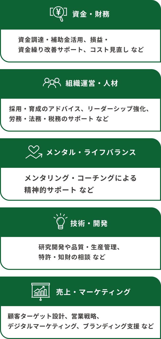 専門家が現状と経営フェーズに応じた最適な支援を行う事業です。