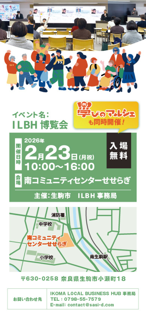主催:生駒市 受託者:株式会社SASI 問い合わせ先:IKOMA LOCAL BUSINESS HUB事務局(株式会社SASI内) TEL:0798-55-7579 MAIL:contact@sasi-d.com