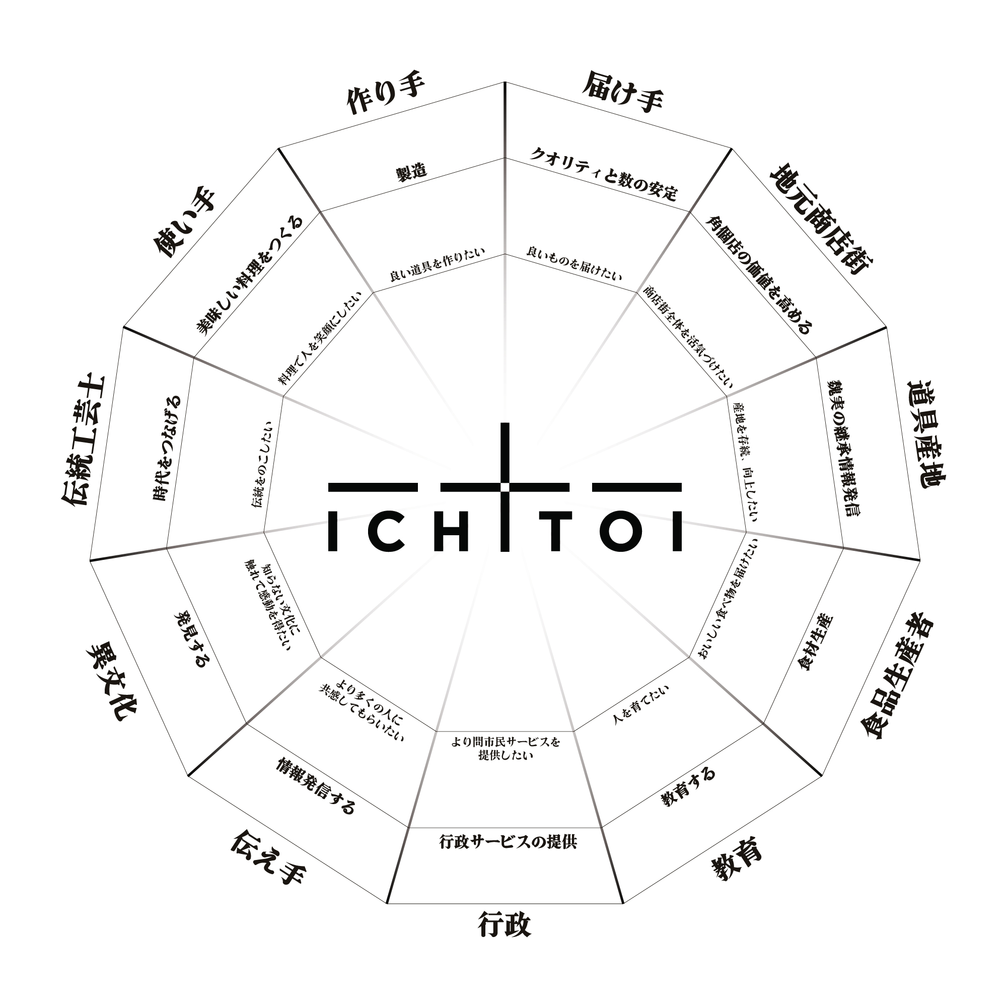 初期のビジョン「料理文化を発展させる」は、ワークショップを経て、より行動を促す「文化を興せ」という言葉に昇華されました。 新コミュニティスペース「一十一」のネーミングには、深い意図が込められています。一文字厨器の「一」と、食文化に関わる11のステークホルダー(使い手、作り手、届け手、地元商店街、道具産地、食品生産者、教育機関、行政機関、伝え手、デザイン会社、異文化/伝統工芸士)を意味する「十一者」に、社会へ「問い(とい)」を立てる場であるという意味を重ね、「一十一(いちとい)」と名付けられました。 この場所は、単なるイベントスペースではなく、Appleストアの2階のワークショップや、文学の聖地であるシェイクスピア・アンド・カンパニーのような、「料理人や包丁職人、生産者、行政、地域の人々が集まるコミュニティの場」を目指しました。コンセプトは「研いで開く」です。